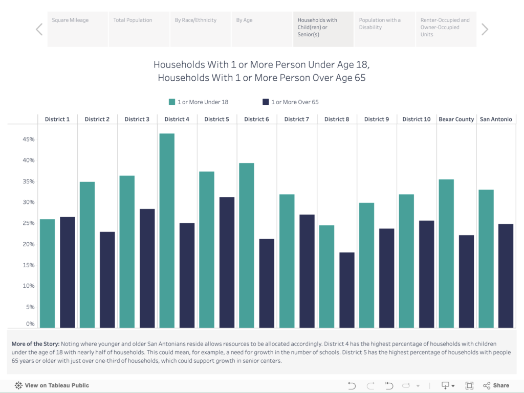 SA2020’s City Council Profiles report disaggregated community data by geography to tell a more complete story of San Antonio’s progress and help identify where targeted policies or investments could have the greatest impact. The report was complemented by Tableau dashboards that gave at-a-glance views of San Antonio demographics and indicators by each City Council District.